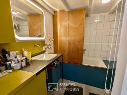 L'entrée se fait par une spacieuse pièce de vie avec de belles hauteurs sous plafond. Séparées par une étagère sur mesure, la partie salon et la partie cuisine se font face. Ce premier niveau est complété par une jolie salle de bain et une arrière cuisine.