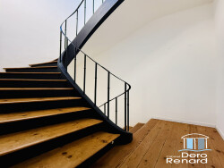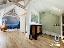 Le premier étage conserve de beaux éléments anciens, notamment un très beau parquet d'époque. Il accueille une chambre, un grand dressing et une salle de bains avec WC. Le second étage est consacré à une belle suite de 26 m², disposant d'un dressing et d'une salle de douches. Les poutres apparentes y apportent un caractère discret. La maison dispose également d'une cave complète et d'un garage de 17 M².