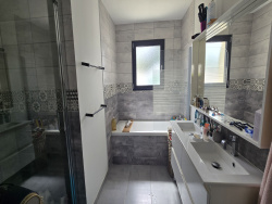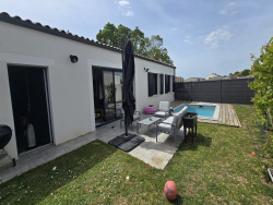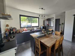 Très jolie maison neuve (jamais habitée) hors lotissement offrant : entrée (placard), WC, pièce de vie de 40 m2 avec cuisine US aménagée/équipée et ilot central, dégagement, 3 chambres avec placards, salle de bains (baignoire + douche) et garage de 25 m2 avec porte électrique. Maison raccordée au tout à l'égout et bien équipée (clim réversible, portail électrique, visiophone). Le tout sur un terrain de 312 m2 avec terrasse.