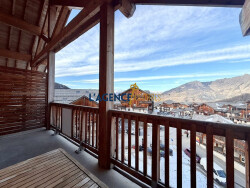 L'appartement s'ouvre sur une vue panoramique dégagée sur la vallée, sans vis-à-vis, offrant un spectacle permanent au fil des saisons. Cette perspective dominante renforce le caractère rare du bien. La grande terrasse est sous une superbe charpente apparente qui confère immédiatement une atmosphère chaleureuse et authentique.