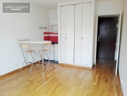 Hall d'entrée parqueté - Pièce principale parquetée de 16,50 m² avec grand placard KZ - Coin cuisine carrelé meublé et équipé (plaque vitrocéramique, réfrigérateur table-top, rangements hauts et bas, plan snack avec tabourets) - Salle de bains modernisée (revêtement PVC imitation parquet) avec lavabo meuble vasque, baignoire, WC et radiateur sèche-serviettes.