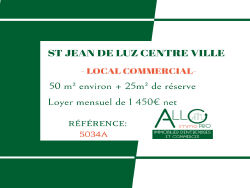 A louer, local commercial situé en centre ville de Saint Jean de Luz, ce local a été récemment rénové . 50m² de surface de vente avec 4m linéaire de vitrine sur axe passant très fréquenté. En plus, une réserve de 25² avec sanitaires vient compléter ce bien. Possibilité de bail dérogatoire ou commercial avec droit d'entrée, tous commerces hors restauration. Loyer mensuel: 1450 euros net Provisions pour charges mensuelles: 50 euros Honoraires: 3 480 eurosTTC Référence:5034A Les informations sur les risques auxquels ce bien est exposé sont disponibles sur le site Géorisques : www. georisques. gouv. fr