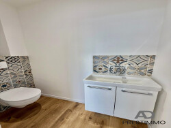 Un sanitaire avec WC suspendu, faïence et lave-mains avec meuble de rangement.