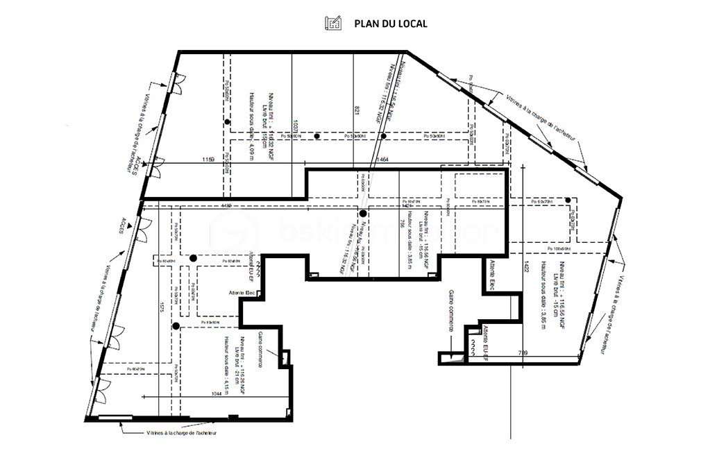 - Rez-de-chaussée : 300 m² avec une hauteur libre de 5,6 m sous poutre (7,5 m au faîtage).