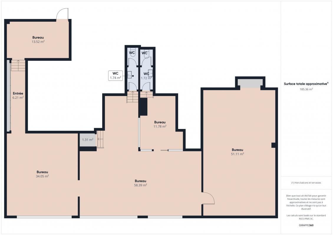 Les locaux se composent de la façon suivante : RDC Open space avec une hauteur sous plafond de 2,50m a 4,50m 2 x bureaux fermés sanitaire garage, cave, réserve pouvant être aménagée en bureau R+1 Open space avec une hauteur sous plafond de 2,50m 2 x bureaux fermés sanitaire R+2 Hall d'accueil