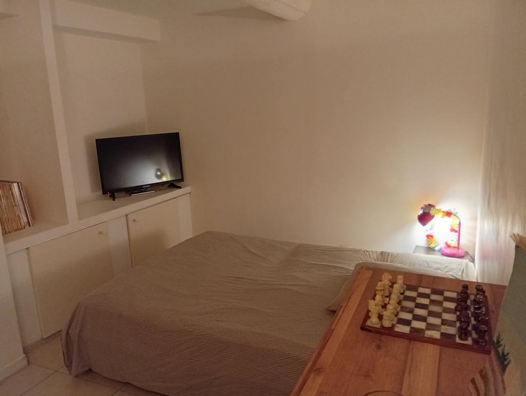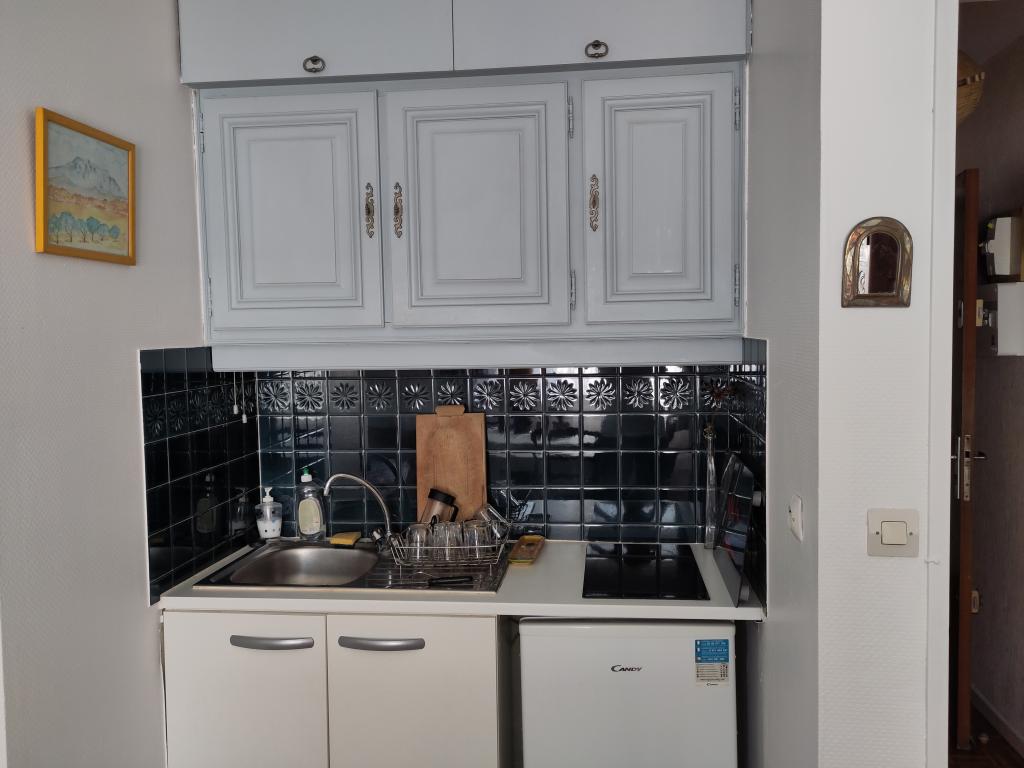 EYGUIERES: Centre, dans petit immeuble, appartement type 2 au 2ème et dernier étage avec salon/Coin cuisine semi équipée, 1 chambre avec salle d'eau, toilettes. Bon état. Libre en janvier.