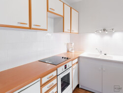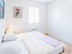 Appartement 2 pièces en rez-de-chaussée avec grande terrasse, situé dans un petit immeuble. Le logement se compose de la façon suivante : un séjour, une cuisine équipée (plaques vitrocéramiques, four, micro-ondes, réfrigérateur, lave linge, lave-vaisselle), une chambre et une salle d'eau.