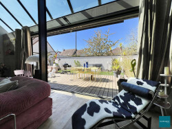 L'entrée s'ouvre sur très un grand espace de vie lumineux de près de 100 m² avec cuisine ouverte. Vous trouverez aussi une grande suite parentale avec chambre, dressing, et salle d'eau. Une buanderie et un garage complètent le rez-de-chaussée.