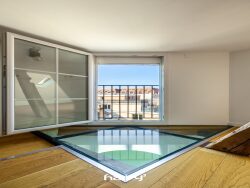 Il se compose d'une cuisine équipée semi-ouverte sur un vaste salon-séjour baigné de lumière, offrant une vue dégagée sur les toits de la ville. Vous y trouverez également deux belles chambres confortables avec dressing, une grande salle d'eau, un WC séparé, un bureau ainsi qu'un cellier.