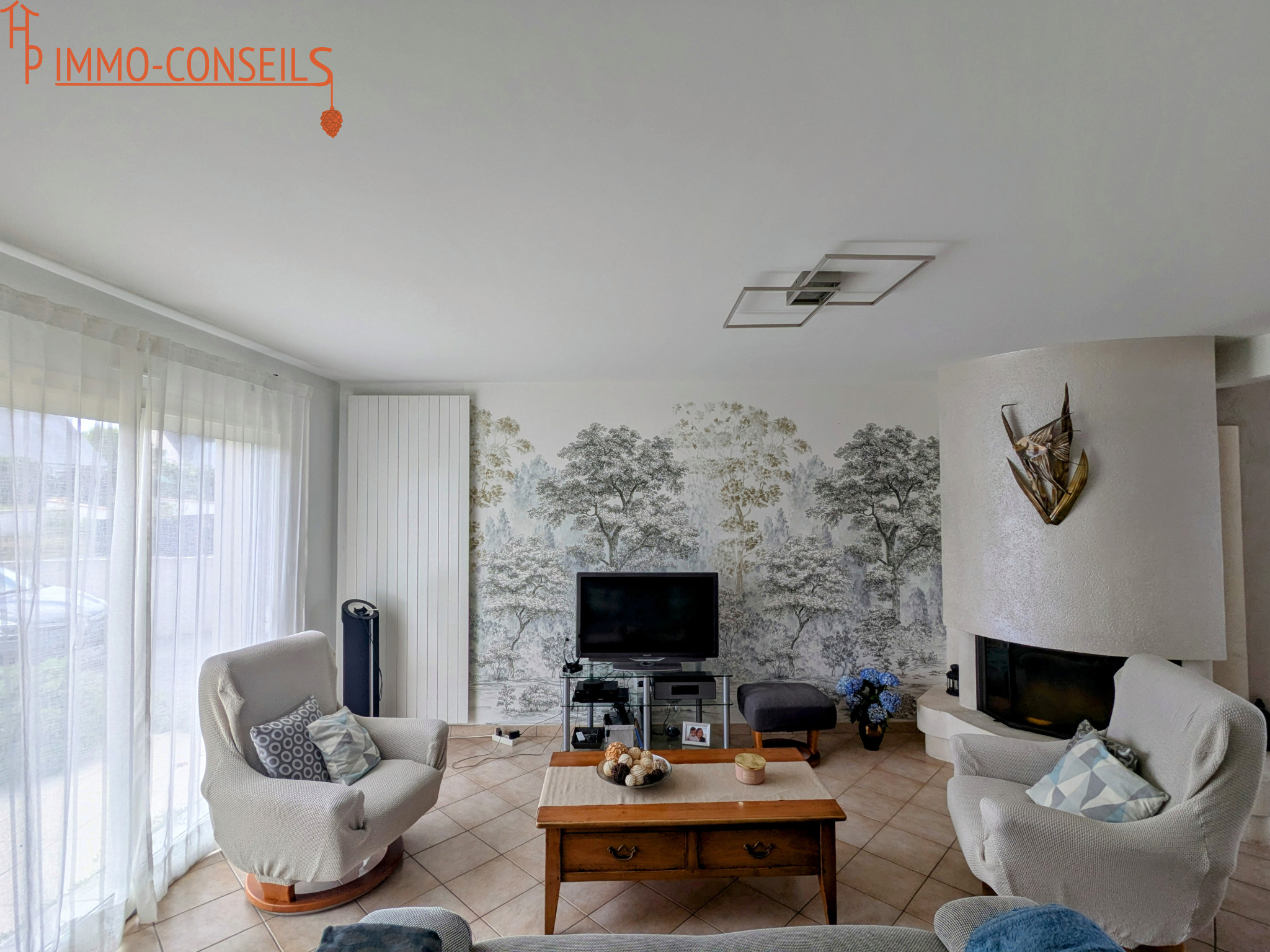L'entrée s'ouvre sur un vaste vestibule distribuant les pièces maîtresses de la maison. Le salon-séjour, avec cheminée et double exposition, donne sur une grande terrasse exposée sud-ouest, avec une vue dégagée sur le jardin.