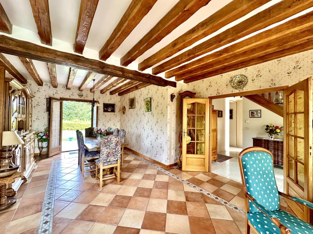 entrée avec cheminée ouvert + poêle à bois, desservant un grand séjour/salle à manger