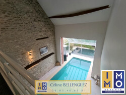 > A l'étage : un palier distribue 3 chambres, 2 salles d'eau, un bureau. Une passerelle surplombant la piscine vous amène à la suite parentale, avec sa salle de bains + WC et son double dressing.