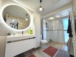 À l'étage, deux chambres dont une avec accès terrasse, un dressing et une salle d'eau moderne avec WC. Un garage et une place de stationnement viennent compléter le bien.