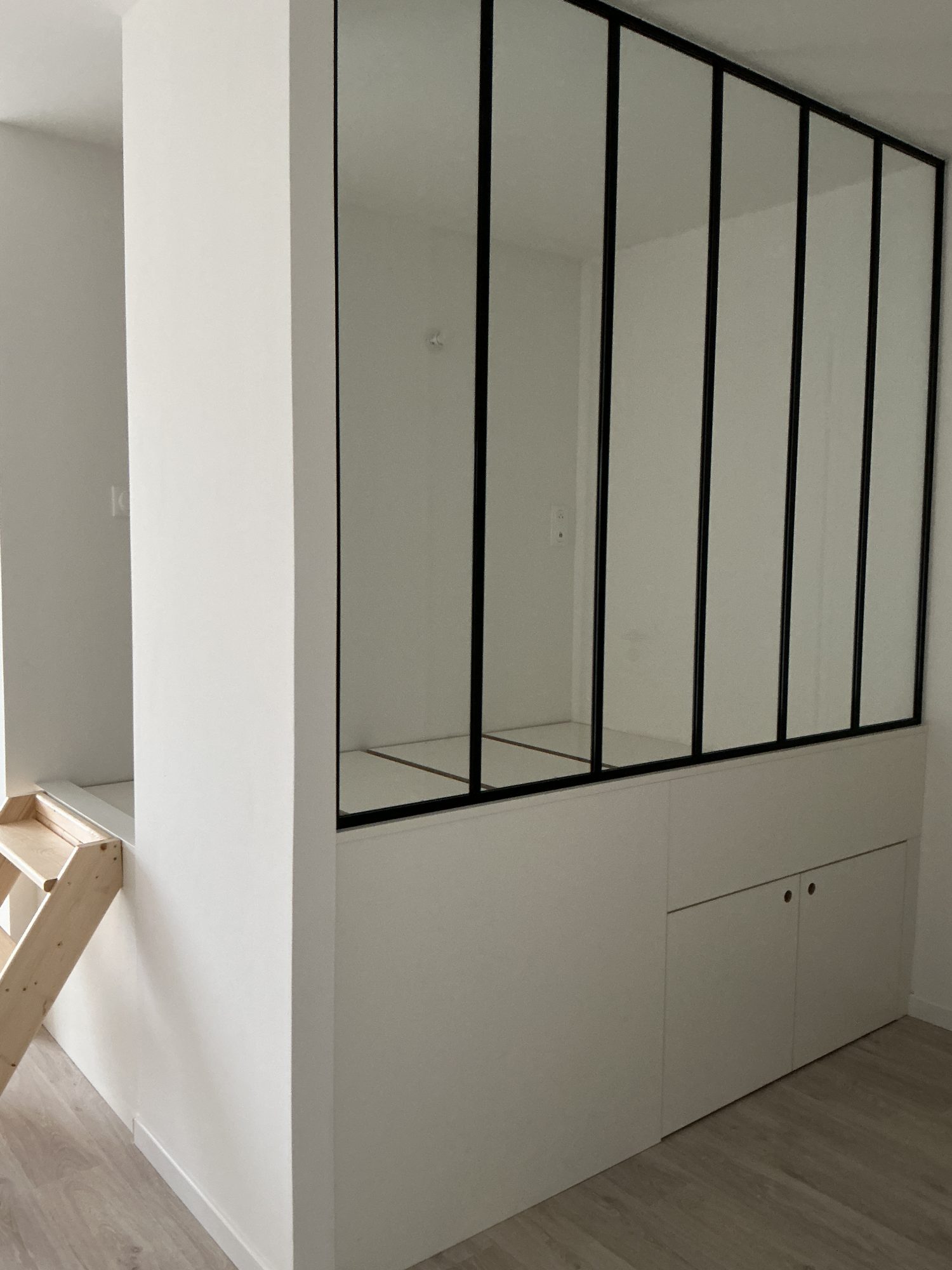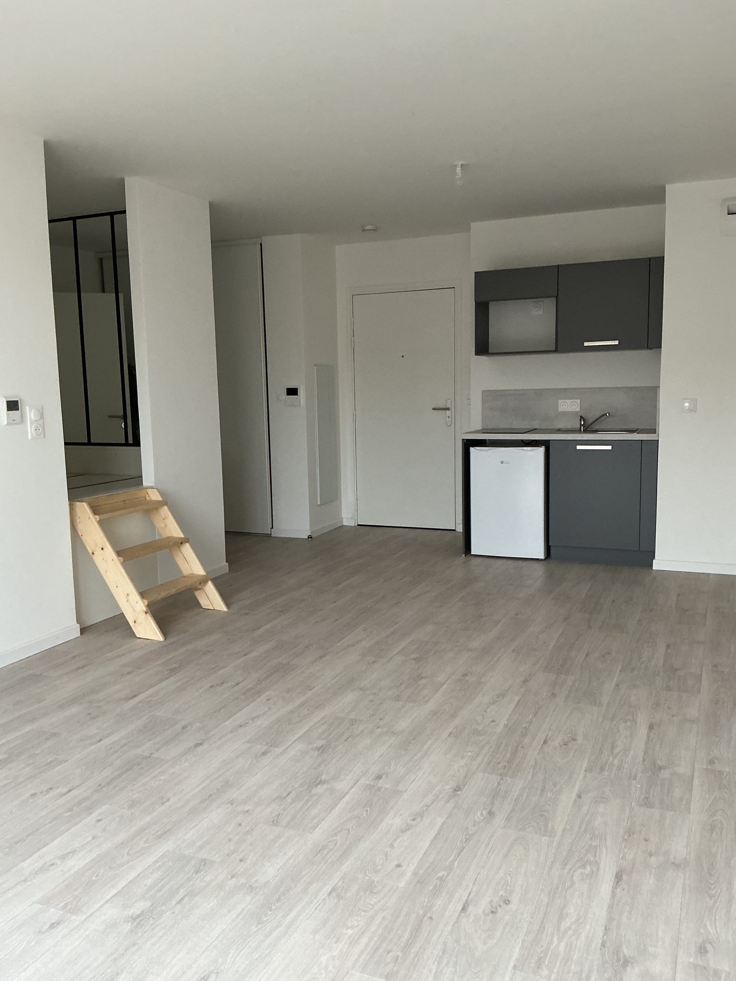 Louviers centre, grand studio de 40 m² en centre ville de LOUVIERS : entrée, cuisine avec plaques de cuisson, hotte et réfrigérateur ouvert sur le grand séjour, salle de douche avec espace pour la machine à laver, wc avec lave-mains.