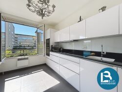 Dans copropriété de standing, au 3ème étage avec ascenseur, bel appartement de 113 M2 avec terrasse et garage double. Exposition Ouest-Sud, vue dégagée. Grand séjour 39 M2, cuisine et sdb meublées et équipées, 2 chambres, buanderie, nombreux rangements. Très bon état général, double vitrage avec stores électriques. Beaucoup de lumière, environnement calme. A deux pas de la gare de la Part-dieu et des Halles de Lyon Paul Bocuse. DPE : D. Pas de procédures en cours. Local vélos.