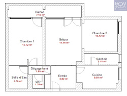 Il se compose d'une entrée, d'un séjour de 15 m2 ouvrant sur un balcon à vivre de 7,19 m2, d'une cuisine séparée meublée et partiellement équipée avec cellier attenant, de deux chambres, d'une salle de douche et de WC séparés. De nombreux rangements complètent ce bien.