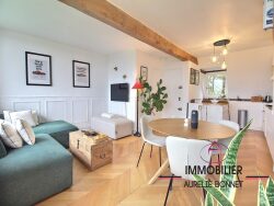 Au coeur d'une résidence de Charme, située sur les HAUTEURS de TOURGEVILLE, dans un environnement calme et préservé, découvrez ce sublime duplex entièrement et parfaitement rénové d'une surface de 45m² en carrez et 59m² au sol. Dès l'entrée vous serez séduit par sa luminosité grâce à sa double exposition et à la magnifique vue dégagée sur toute la vallée et la mer. Il dispose au premier niveau d'une chaleureuse pièce à vivre avec une cuisine ouverte ultra fonctionnelle, un espace séjour, un wc indépendant, à l'étage une suite parentale. Possibilité de stationner librement et facilement dans la résidence.