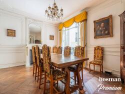 L'appartement s'ouvre sur une spacieuse galerie d'entrée menant à un double séjour de 50 m² exposé ouest, prolongé par un balcon. Il dispose également d'une salle à manger conviviale de 22 m², d'une cuisine indépendante avec escalier de service, ainsi que de trois grandes chambres au calme, donnant sur cour. Côté pièces d'eau, l'appartement offre deux salles de douches, une salle de bain et deux WC, dont un séparé.