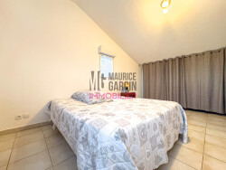 En excellant état général, il dispose d'une belle pièce à vivre climatisée avec cuisine ouverte donnant sur la terrasse extérieure. Au même niveau, on y retrouve une chambre avec salle d'eau, un WC indépendant et un hall d'entrée avec placards. A l'étage, 2 grandes chambres avec placards avec une très belle hauteur sous plafond vous attendent, ainsi qu'une salle de bains avec WC.