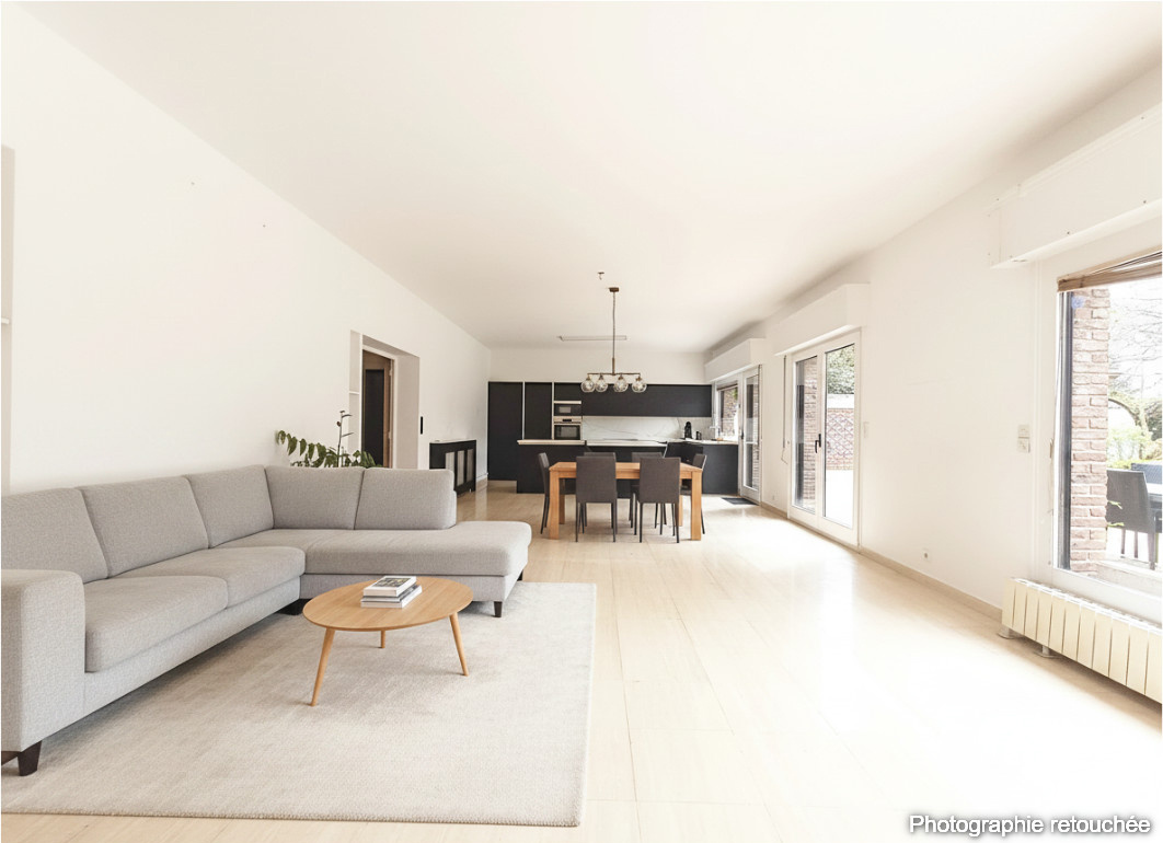 Le rez-de-chaussée propose de beaux volumes avec une grande pièce de vie regroupant salon et salle à manger. De larges baies vitrées donnent directement sur le jardin. Cuisine, arrière-cuisine, cellier, chaufferie et plusieurs pièces annexes complètent ce niveau.