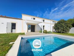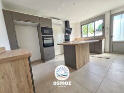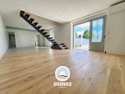 Elle se compose au rez-de-chaussée, d'une entrée, une pièce de vie lumineuse de 39 m², une cuisine aménagée et équipée, un cellier, une suite parentale avec salle d'eau, WC et dressing. À l'étage, 3 chambres dont une suite avec dressing et salle d'eau, une salle de bain, un WC et une salle de jeu.