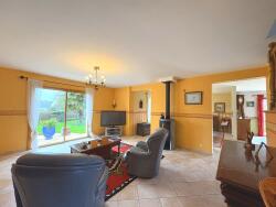Au rez-de-chaussée : une entrée , un séjour lumineux, un spacieux salon avec poêle à bois, une cuisine aménagée et équipée, une chambre , une salle de bains avec douche, toilettes. A l'étage : une grande mezzanine desservant trois chambres , une salle d'eau et toilettes. Un garage. Un second garage avec grenier. Terrain clos et paysagé Un appentis Terrasse carrelée.