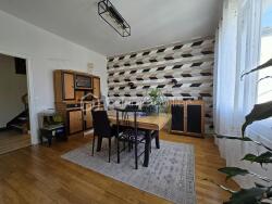 Vaste hall de distribution, salon/salle à manger lumineux avec poêle à granules, cuisine moderne aménagée et équipée (réfrigérateur, congélateur, four, lave-vaisselle, hotte, comptoir repas), le tout ouvert sur une véranda avec coin repas. Une suite parentale avec salle de bains complète l'étage.