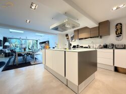 Au rez-de-chaussée : une entrée avec dégagement, un cellier avec espace buanderie, un WC indépendant, ainsi qu'une magnifique pièce de vie de plus de 40 m² comprenant une cuisine ouverte Poggenpohl, un espace salon / salle à manger avec un accès direct à l'extérieur.