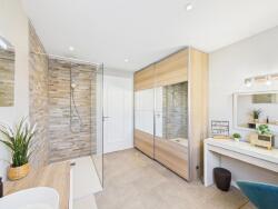 Un WC indépendant ainsi qu'une magnifique salle de bain est accessible en enfilade du WC. Quelques marches donnent accès à la grande chambre à coucher de 16 m2.