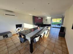 Cette maison dispose d'une entrée sur une grande pièce de vie de 57m², comprenant un espace de salon séjour qui propose une grande baie vitrée qui donne sur une grande terrasse de 40m² et son jardin. Cette pièce de vie propose également un espace de cuisine semi-ouverte, aménagée et équipée.