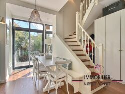 EXCLUSIVITÉ TROUVILLE-SUR-MER À seulement 200 mètres des quais et 900 mètres de la plage, cette charmante maison de ville de plus de 140 m² au sol offre des volumes particulièrement généreux, rares à Trouville, ainsi que deux agréables terrasses exposées sud-ouest, à l'abri des regards. Le caractère de la maison se révèle dans chaque pièce grâce à des matériaux de qualité, tout en garantissant un confort de vie optimal et des espaces bien pensés. Au rez-de-chaussée, vous découvrirez un séjour chaleureux avec cheminée ainsi qu'une cuisine familiale aménagée et équipée, ouvrant directement sur les terrasses arborées. Le premier étage propose un palier desservant un WC indépendant, une chambre, ainsi qu'une suite parentale avec salle de bains et balcon. Au second niveau, deux chambres, dont l'une avec dressing et l'autre particulièrement spacieuse, idéale en dortoir ou espace multifonction. Cette propriété réunit tous les atouts d'une résidence secondaire idéale : un emplacement privilégié, calme tout en étant à proximité immédiate des commerces, de la gare et de la plage, des extérieurs faciles d'entretien pour profiter pleinement des beaux jours, et des volumes parfaitement adaptés à une maison de famille.