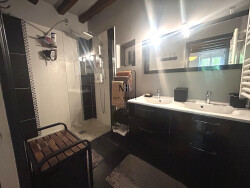 Elle comprend au RDC, une entrée donnant sur une agréable pièce de vie avec poêle à granulés et cuisine aménagée et équipée. Un salon , une salle de douche et un WC indépendant se trouvent également à ce niveau.