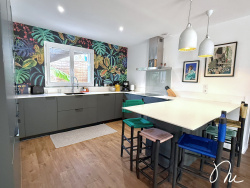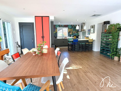 Vous entrez dans une vaste et lumineuse pièce de vie qui s'ouvre généreusement sur le jardin via une baie vitrée à galandage. La cuisine moderne, reste entièrement aménagée et équipée. Vous trouvez également des wc séparés, un espace buanderie pour plus de praticité au quotidien et une chambre au RDC.