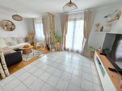 Cette maison dispose d'une entrée qui dessert une grande pièce de vie de 51m², composée d'une cuisine récente ouverte aménagée et équipée, d'un espace de séjour, ainsi que qu'un espace de salon, dont la porte fenêtre donne sur une magnifique terrasse sur pilotis de 21m² qui domine le jardin, La pièce de vie propose un poêle à granules pour de belles soirées au coin du feu .