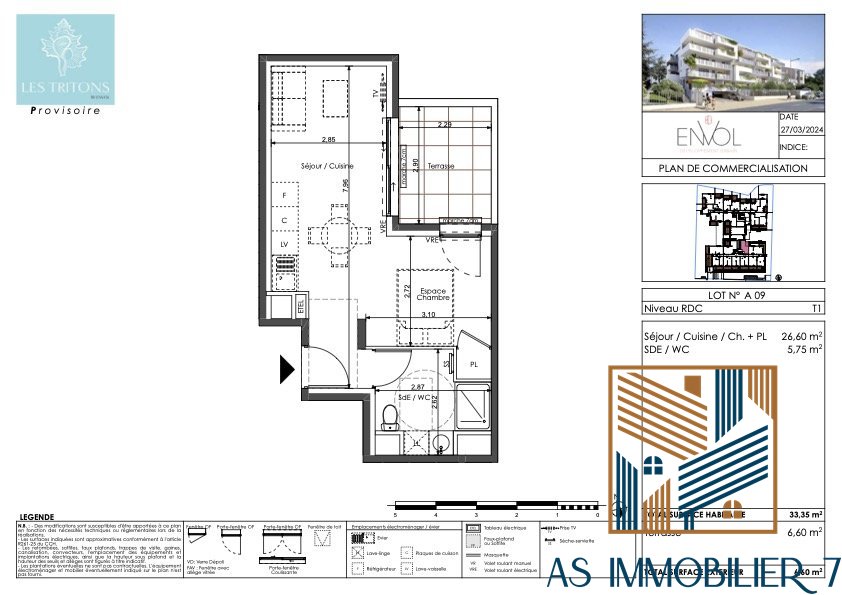 T2 de 44,30 m² + terrasse de 7 m² ? Surface privative totale : 51,30 m² 1er étage avec ascenseur Exposition Nord/Ouest : fraîcheur en été, belle luminosité Cuisine équipée : plaque de cuisson + hotte intégrée Salle d'eau aménagée : meuble vasque, miroir, sèche-serviettes Menuiseries double vitrage haute performance Volets roulants électriques Parking privatif en sous-sol