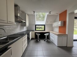 Cette jolie maison erigée sur un beau terrain de 1500 m2 arboré et paysagé avec gout, offre une vaste entrée avec vestibule, vaste séjour de 45 m2 avec poêle à bois, cuisiné équipée et aménagée avec gout, bureau avec vue jardin, buanderie.