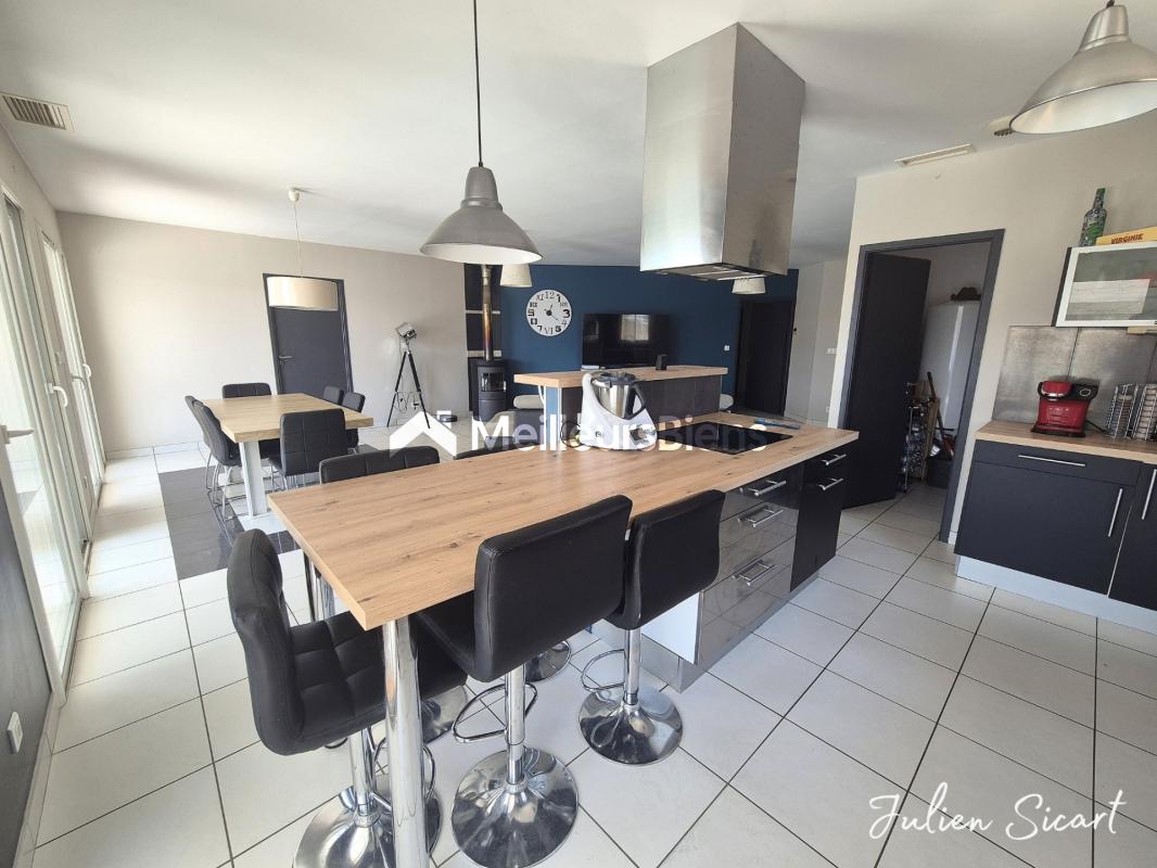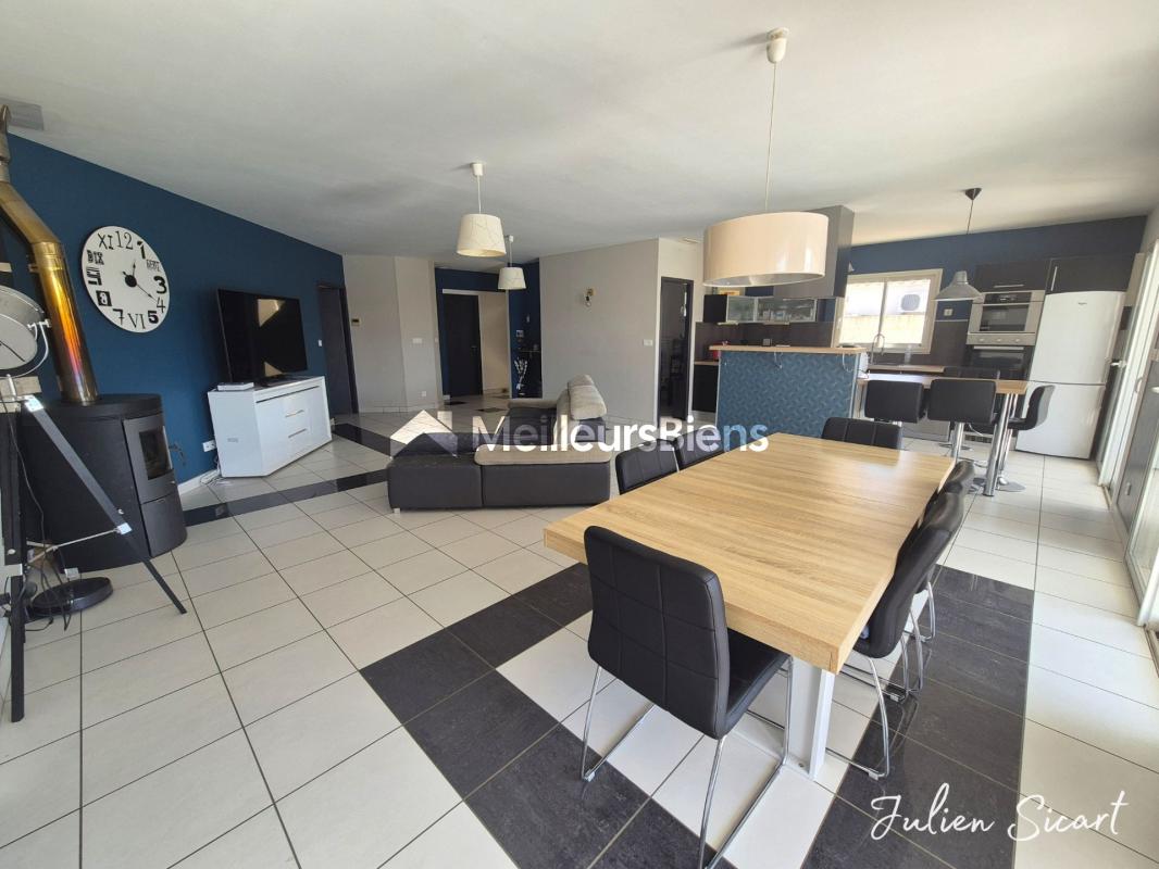 Au rez-de-chaussée : Un hall d'entrée dessert une pièce de vie exceptionnelle, composée d'un immense séjour salle à manger cuisine ouverte, baigné de lumière grâce à ses grandes baies vitrées aluminium double vitrage avec volets électriques. L'intérieur se prolonge naturellement vers l'extérieur, offrant une sensation d'espace remarquable. Une cheminée à foyer fermé vient sublimer ce niveau, idéale pour de chaleureuses soirées d'hiver tout en garantissant une économie de chauffage. Vous trouverez également :