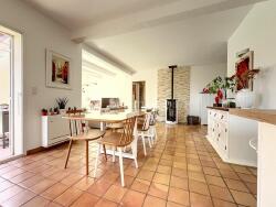 Au rez-de-chaussée, elle offre une spacieuse pièce de vie d'environ 60 m², baignée de lumière, disposant d'un poêle à granulés et ouverte sur la cuisine.