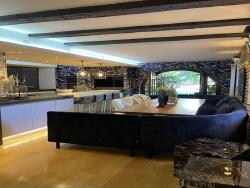 La spacieuse cuisine dînatoire s'ouvre directement sur le jardin privatif. L'espace de réception, quant à lui, se distingue par un salon avec cheminée et une salle à manger, créant une ambiance chaleureuse.