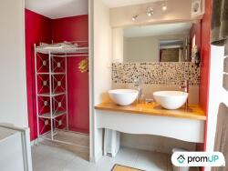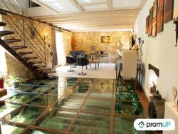 Au rez-de-chaussée, la pièce à vivre de 73 m² a une partie salon où se trouve, en sous-sol, un aquarium de 20 m². La cuisine aménagée est équipée. Au même niveau, vous trouvez une chambre de 15 m² et une salle d'eau. Il y a également un WC et la buanderie.