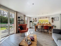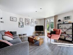 EXCLUSIVITÉ Située à Poisy, à environ 700 mètres des commerces de Poisy, de ses écoles maternelles et primaires, à 9 km d'Annecy, 3 km de la zone commerciale d'Epagny et à 5 km des axes autoroutiers, sur un terrain de 220 m2, plat, clos et arboré, mitoyenne par le garage, édifiée en 1987 environ, dans un lotissement, en copropriété horizontale, d'une surface habitable de 111,25 m2 environ et plus de 140 m2 au sol, comprenant 4 chambres, exposée est, lumineuse, sur 3 niveaux, elle se compose ainsi : au rez-de-chaussée, une entrée avec placards rangements, une cuisine équipée ouverte sur le salon - salle à manger de 38,32 m2 donnant sur la terrasse de 25,11 m2 et la jardin exposé est, un WC suspendu avec lave-mains et rangement et un garage attenant de 20,12 m2 avec chaufferie-buanderie avec porte de service donnant sur le jardin, à l'étage, un grand dégagement desservant trois chambres de 10,76 m2 (+ 0,65 m2 au sol), 10,04 (+9,31 m2 au sol) et 7,91 m2 dont une avec placards, et une salle de bains avec douche, meuble vasque, fenêtre et radiateur sèche-serviette, dans les combles, une grande chambre en sous pente de 14,98 m2 Loi Carrez (+ 15,67 m2 au sol) avec placards aménagés, avec possibilité d'aménager une salle d'eau,