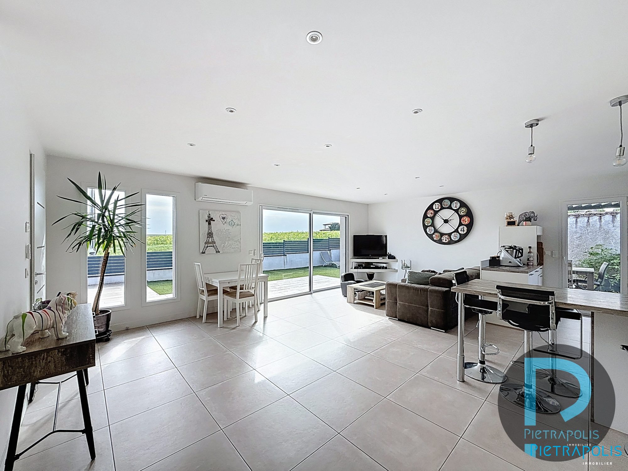 Elle se compose d'une entrée avec placard, d'une pièce de vie spacieuse de 43 m² avec salon et cuisine ouverte, donnant un accès direct à la terrasse et au jardin.