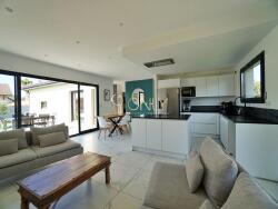 Elle se compose d'une entrée avec placard, d'une pièce de vie spacieuse de 43 m² avec salon et cuisine ouverte, donnant un accès direct à la terrasse et au jardin.