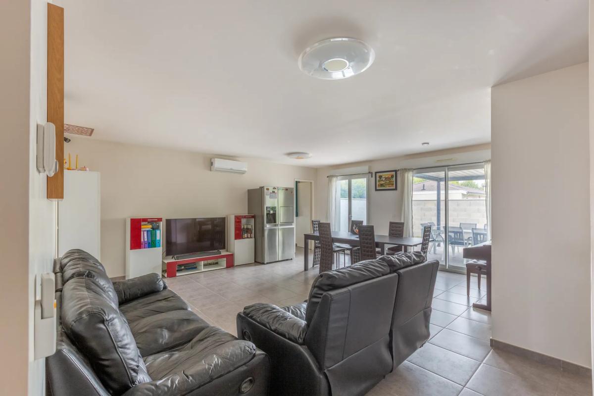 Elle se compose d'une entrée avec placard, d'une pièce de vie spacieuse de 43 m² avec salon et cuisine ouverte, donnant un accès direct à la terrasse et au jardin.