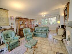 Il dispose d'une entrée desservant une cuisine, un espace à vivre entre salle à mangers et séjour/cheminée, un espace