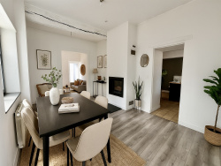 Une pièce de vie lumineuse avec cheminée et accès direct à la terrasse,