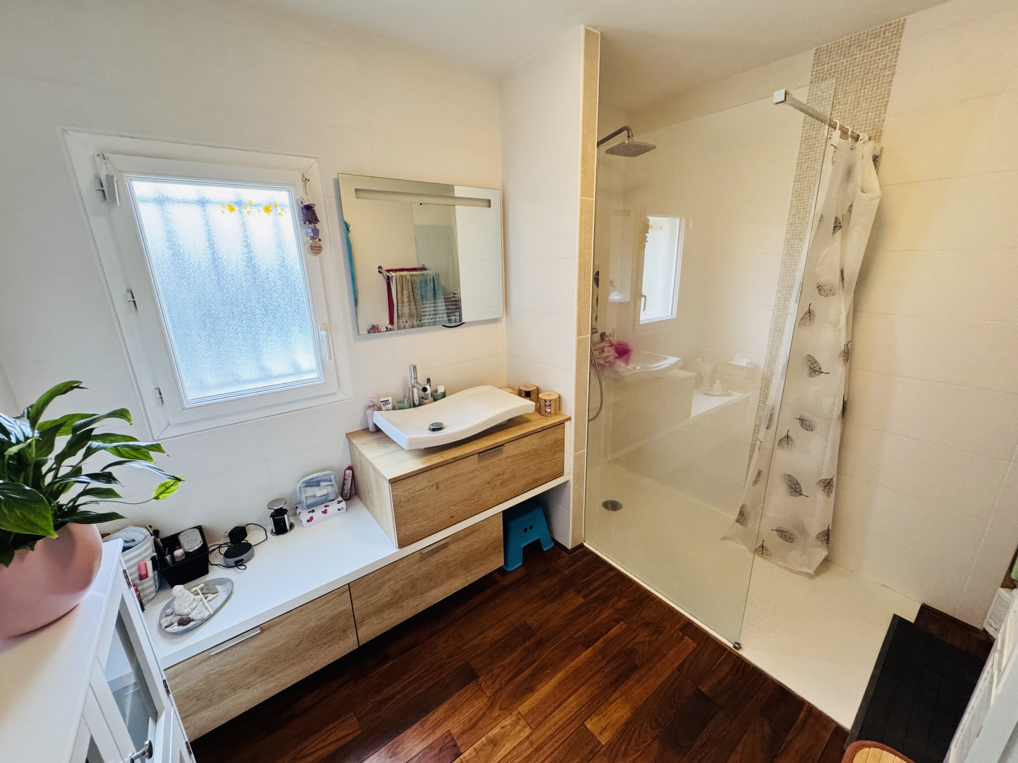 Elle se compose d'un hall d'entrée avec placard, d'une pièce de vie de 70m² avec cuisine ouverte (aménagée et équipée) donnant sur une terrasse couverte de 15m² et 1 cellier/buanderie. Côté nuit : 4 chambres dont 1 suite parentale avec dressing et salle d'eau de 21m², 1 salle de bains avec douche et baignoire, 1 wc indépendant.