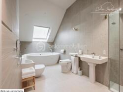À l'étage, profitez d'un grand salon lumineux de 27 m², de deux chambres de 12 m² chacune, d'une salle de bain avec WC et d'une mezzanine pouvant être transformée en cinquième chambre ou espace de loisirs. Le grenier aménageable offre des options supplémentaires pour personnaliser l'espace selon vos besoins.