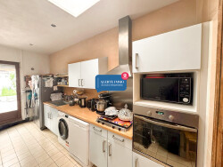- Une cuisine de 13 m2 avec carrelage au sol, puit de lumière, aménagée de meubles hauts et bas et équipée d'un four et d'une hotte. Porte fenêtre avec volet roulant électrique. Sortie terrasse,jardin et dépendance.