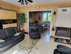 Maison comprenant une entrée desservant un salon avec balcon et insert bois, ouvert sur une salle à manger, une cuisine équipée et aménagée, un WC, une salle de douche équipée et aménagée, deux chambres.